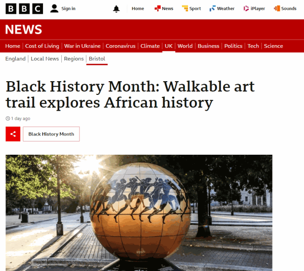 Globes to go in Bristol until 31st October 18 Oct 2022'The inspiration for my globe was the theme The Reality of Being Enslaved. I started by looking at, and thinking of, all the enslaved peoples...Read more -
