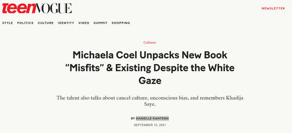 Quoted by Michaela Coel in : Michaela Coel Unpacks New Book “Misfits” & Existing Despite the White Gaze