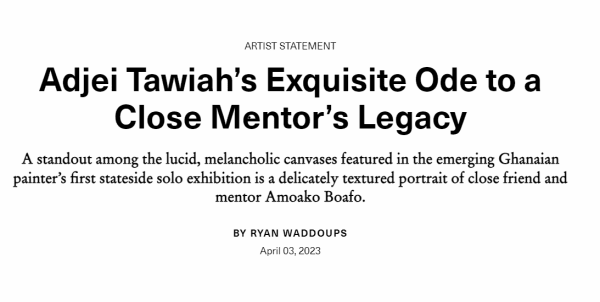 Solo exhibitions include I Miss Us, Opera Gallery, New York, NY, USA (2023) and Threads of Past and Present, Gallery 1957, London, UK (2022). Group exhibitions include +4000 Ans D’art Africain, Ross-Sutton Gallery (2022); 18 (Rising Ghana), PM/AM Gallery, London, UK (2022); Winner Takes All, Marianne Boesky, New York, USA, curated by Amoako Boafo and Larry Ossei-Mensah (2022); Self-Addressed, Jeffrey Deitch Gallery, Los Angeles, curated by Kehinde Wiley (2021); Eric Adjei Tawiah & Aplerh-Doku Borlabi: Could You Be Loved, Gallery 1957, Gallery III, Accra, Ghana (2021) and Collective Reflections: Contemporary African and Diasporic Expressions of a New Vanguard, Gallery 1957 Gallery I and II, Accra, Ghana (2020). Tawiah has participated in 1-54 London, Art Brussels, Art X Lagos and Market Hamptons Fairs.