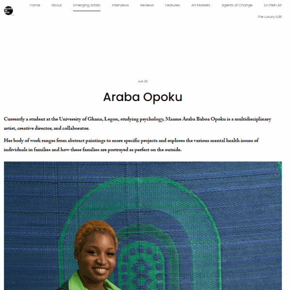 Balancing her art practice with her education in Psychology at the University of Ghana, Opoku has exhibited her works at several group exhibitions in Ghana, the UK, and USA. Her work was showcased at Art X Lagos in 2021, and resides in several collections in New York, London, and Ghana. For her artistic talent she was awarded the inaugural Yaa Asantwewaa Art Prize by Gallery 1957 in 2021. Opoku is the creative director and member of the art collective Artemartis, which has done much to highlight and platform emerging artists in Ghana.